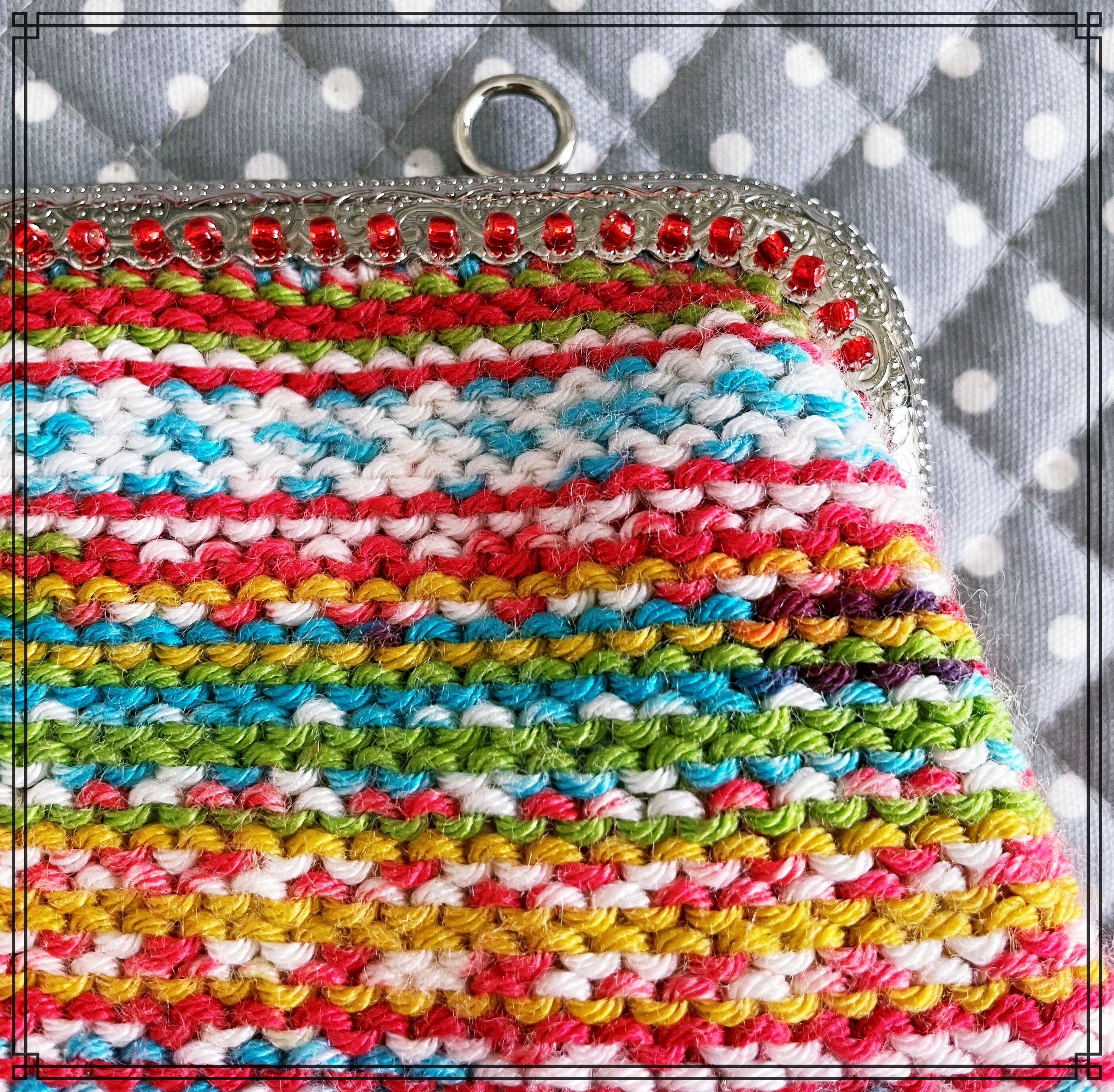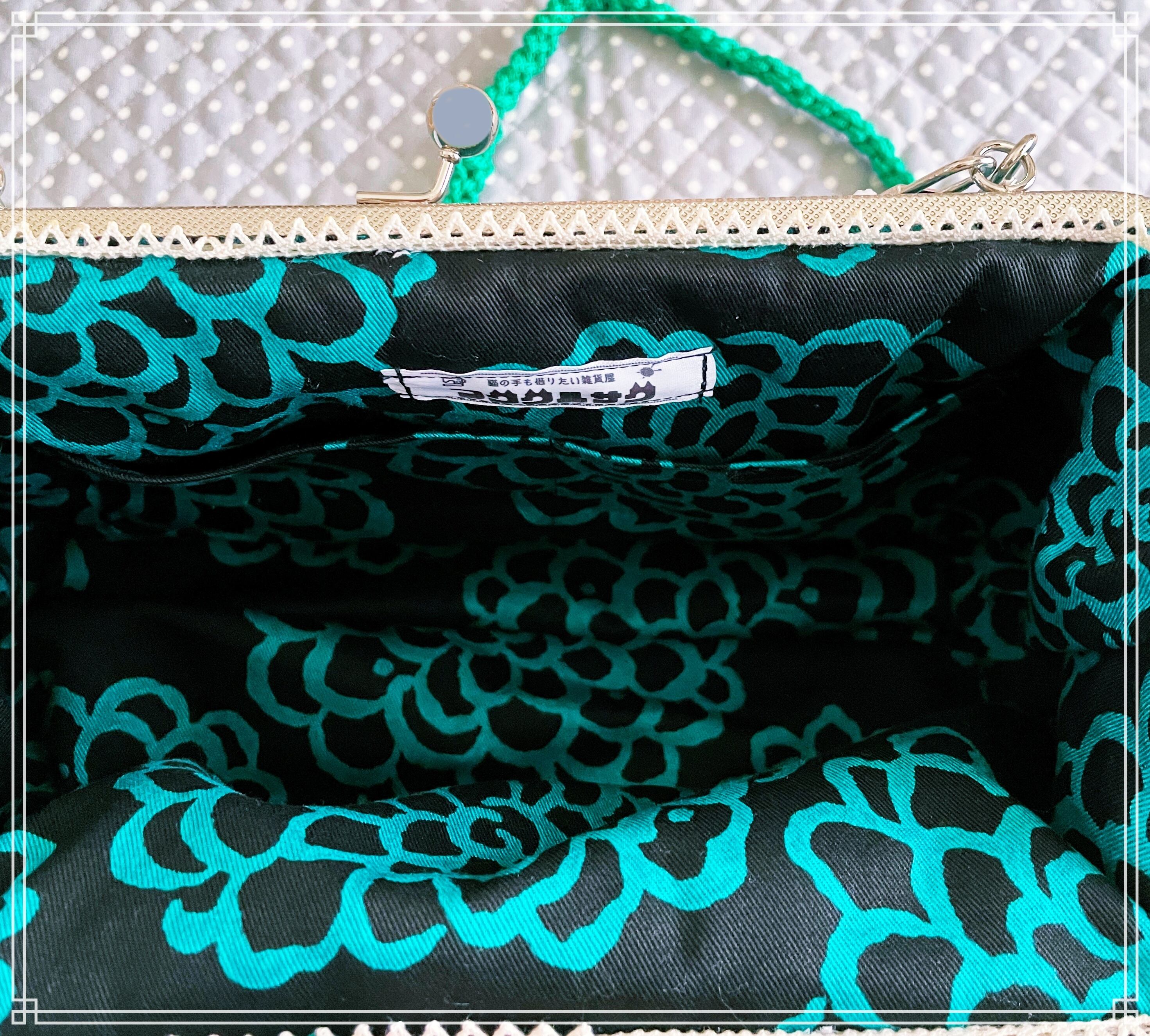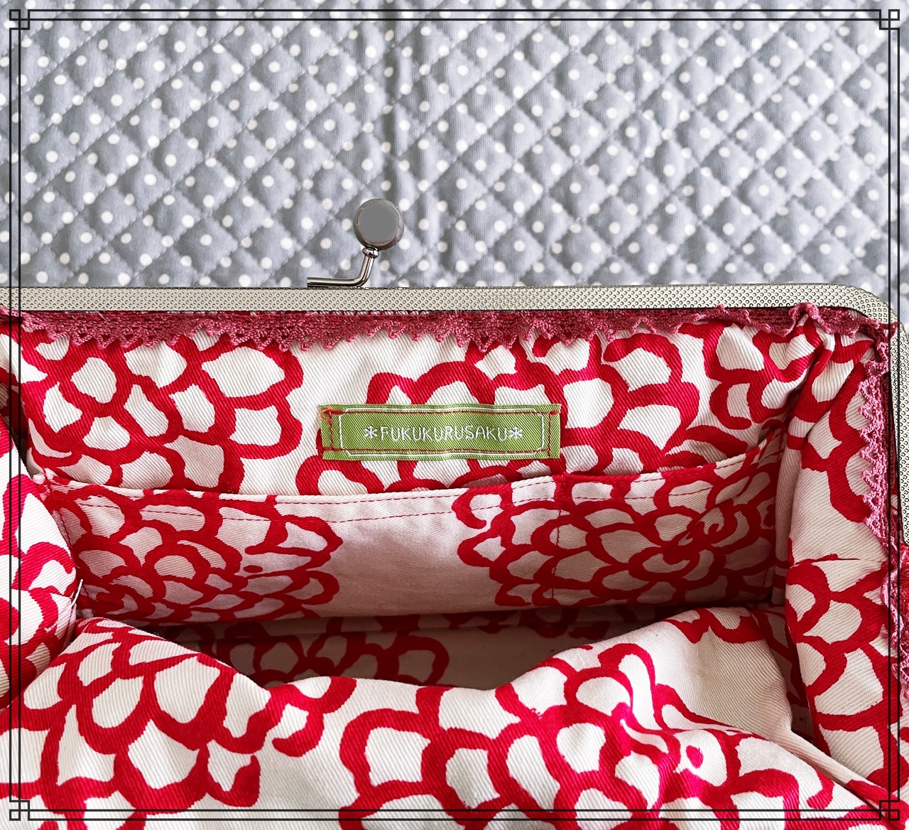 がま口は縫い付けタイプのもので、がま口周囲にビーズで装飾しています。